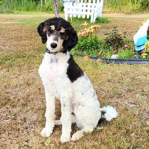 Forrest is a beautiful black white and tan medium sized poodle who weighs 35lbs. He is a very smart and loving boy. He loves to play fetch and and has so much fun playing in the yard. Forrest and Randie, who is 42lbs will have puppies due April 30, 2026.